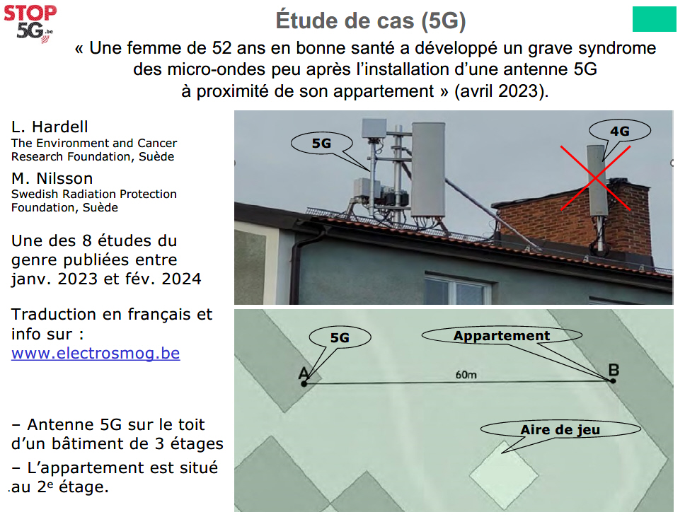 Note : les 2 antennes 5G incriminées se trouvent à environ 500 m du domicile. Le résumé en français. L’étude en anglais.