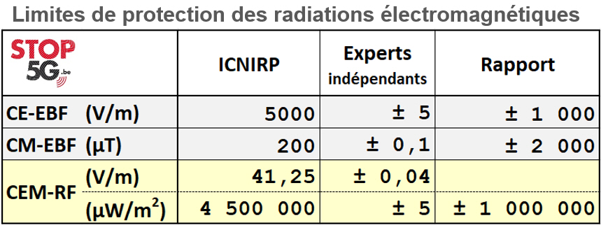 Les normes de protection officielles, comme relayées par l’OMS, l’UE et la quasi-totalité des agences de protection de santé nationales, comparées aux recommandations des experts indépendants.