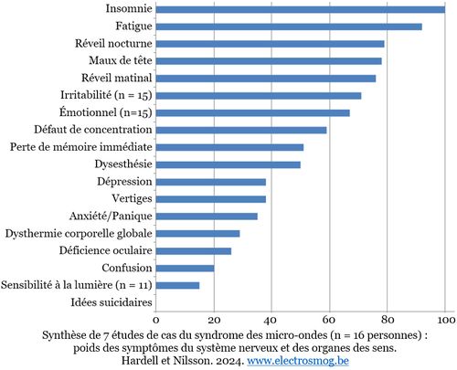 Entre janvier 2023 et février 2024, huit études de cas[0] ont été publiées qui montrent toutes que des personnes en bonne santé ont développé des symptômes graves après la mise en service d’une antenne 5G (bande de 3,5 GHz) à proximité de leur lieu d’habitation ou de travail, mais que ces symptômes disparaissaient pour la plupart, plus ou moins rapidement, lorsqu’elles allaient habiter ou travailler ailleurs. Ces symptômes sont ceux du syndrome des micro-ondes, aussi appelé maladie des micro-ondes, une maladie identifiée dès les années 1960 par des chercheurs des pays de l’Europe de l’Est[1] : maux de tête, troubles de l’équilibre, difficultés de concentration, confusion, fatigue, insomnie, arythmie, brûlures cutanées, saignements de nez, douleurs articulaires et musculaires, dyspnée, etc.